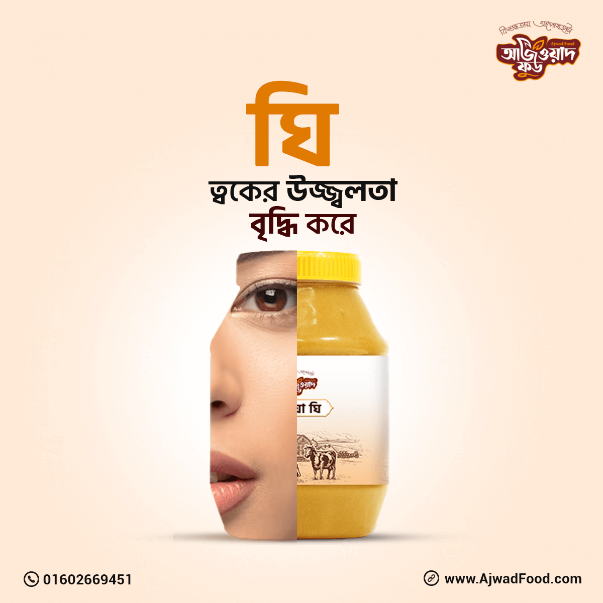 - ত্বকের উজ্জ্বলতা বৃদ্ধির ক্ষেত্রে ঘি বেশ উপকারী। তাই সামান্য পরিমান ঘি নিয়ে ম্যাসাজ করুন আপনার স্কিনে। ঘি এর মধ্যে বিদ্যমান রয়েছে ভিটামিন ই এবং কে যা আমাদের স্কিনের উজ্জ্বলতা বৃদ্ধির ক্ষেত্রে বেশ গুরুত্বপূর্ন ভূমিকা পালন করে।